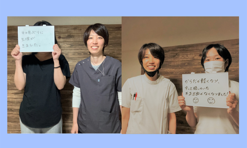 施術では傷あとを柔らかくし、お腹の気血の流れがよくなるようにおこなった結果、来院後は不正出血もなく予定通り生理がはじまったそうです。