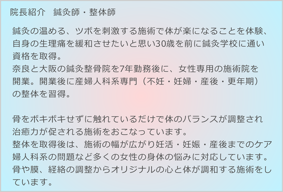 不妊 婦人科系専門、全体の気血の流れを循環させる整体鍼灸をおこなっています。